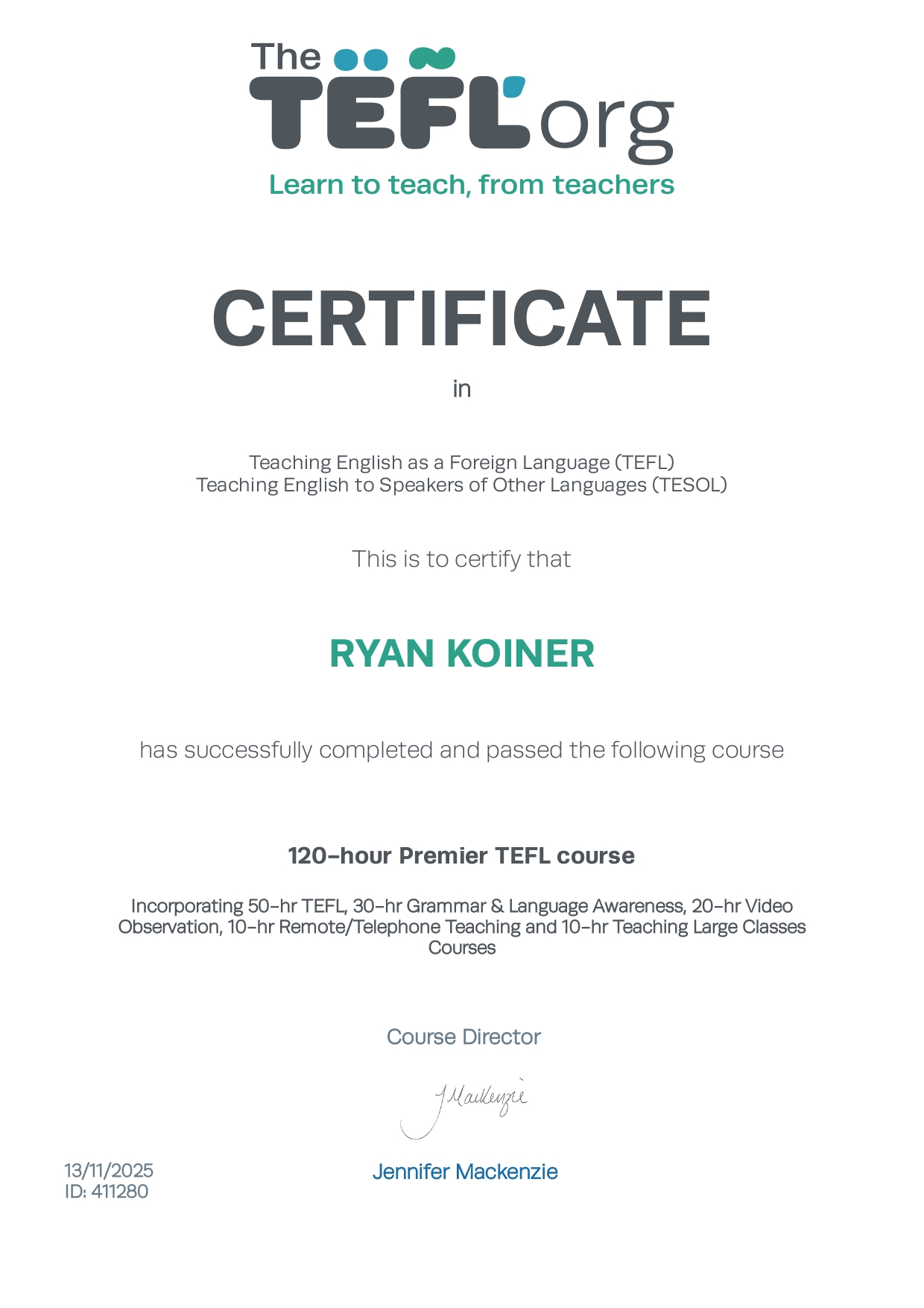 ※11月13日2025年現在、私は外国語としての英語を教えるためのTEFL資格を取得しました。